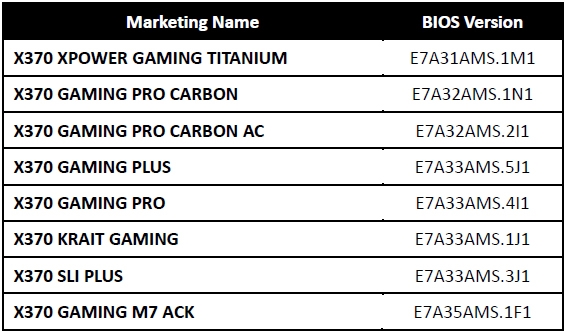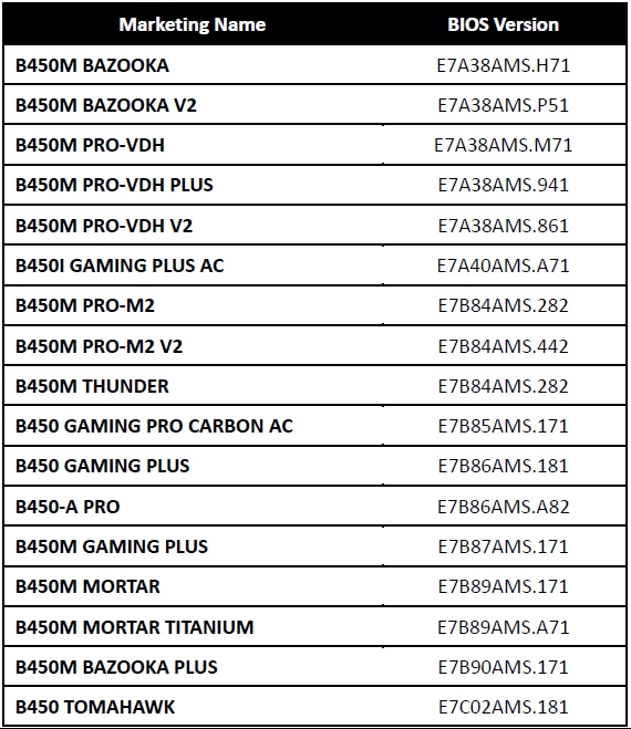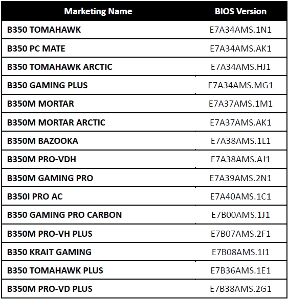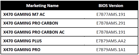 同时,微星公布了与三代锐龙兼容的主板型号列表,涵盖了微星现有的全部300、400系列主板,包括5款X470、17款B450、8款X370、15款B350(没有入门级的A320),并给出了可支持三代锐龙的BIOS版本号,均基于最新的AMD Combo PI 1.0.0.0。