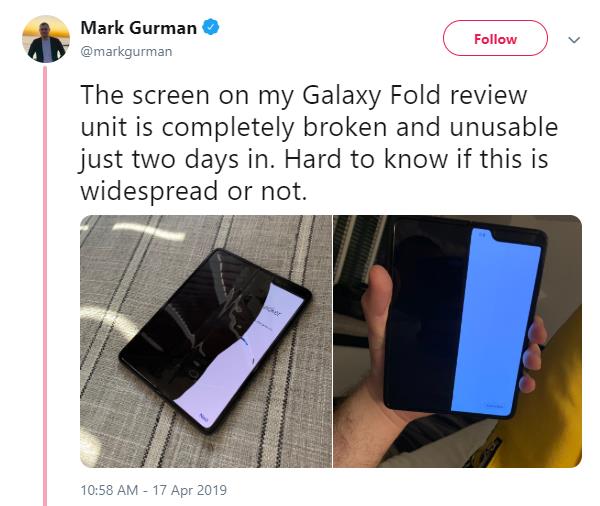 4月17日,CNBC作者Steve Kovach在Twitter上表示,在使用了一天之后,他手中的Galaxy Fold的折叠屏出现了闪屏和断屏的情况,屏幕中间出现断裂,最后屏幕的左侧部分完全变成一片黑暗,两天之后,这款手机完全不能使用——但是这款评测机没有去掉保护层。