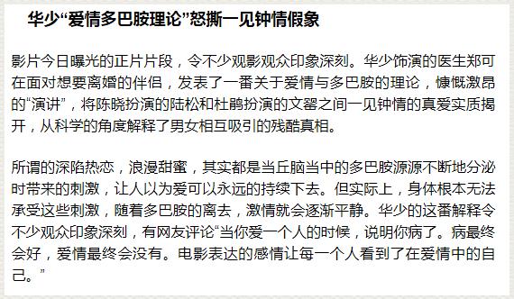 爱情电影《如影随心》最近在影院放映,虽然因为各种原因,电影口碑和票房双“扑街”,但片中华少饰演的医生郑可在面对想要离婚的伴侣时,发表的一番关于爱情与多巴胺的理论,却让很多人影响深刻,在网上引起热议。