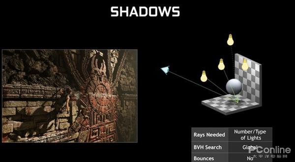 古墓丽影11中光追特效只用在了阴影中,计算量高于单一的反射,但是还不及二次反射和全局光照。